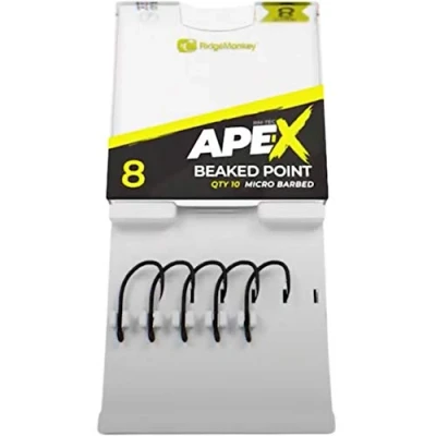 RidgeMonkey Ape-X Beaked Point Barbed - Ultra sharp hook point - 10 pieces per package - Available in different sizes - Super strong Japanese Carbon 80 steel - 10 ° downward pointing eye - Forged bend and shank - Unique RM-Tec Gun Metal Coating - Long needle point with Micro Barb Combining many years of manufacturing and angling experience, the Ape-X range of hooks has been designed for every fishing situation for carp and other heavy duty coarse fishing. Our state of the art manufacturing processes have been extensively tested for over two years and utilise the most advanced hook point technology available, allowing Ridgemonkey to produce a range of hooks that are unrivalled in strength, sharpness and resistance. Many carp anglers trust the Ape-X hooks because they absolutely will not let you down! Try it yourself. For more information watch the video below: