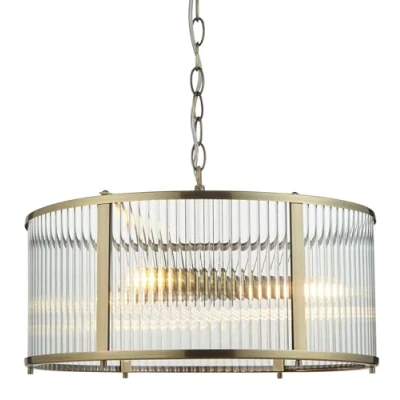 AmazonAntique brass plated metalwork Clear ribbed glass panel shade Height adjustable 1.5 metre chain with clear cable H: 400-1760mm Dia: 450mm Weight: 3.8 Kg Requires 3 x LED E14 (bulb not included)