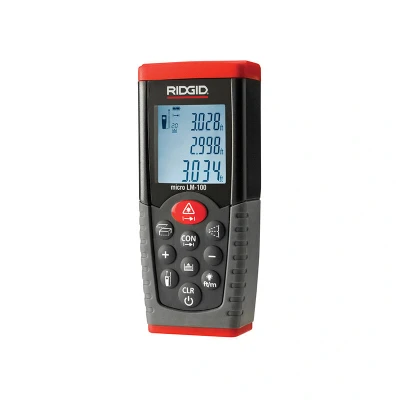 General description The Ridgid Micro LM-100 Laser Distance Measure provides simple, quick, and accurate distance readings with its ultra-sharp Class II lasers. It features an easy-to-read LCD display that shows distance readings in feet, inches, and meters. This device is ideal for professional tradesmen to quickly determine run distances for bidding, calculate the distance of piping runs, measure trouble spots down the line, and quickly determine spacing for code compliance. Technical specifications Accuracy: ±1.5mm Operating Range: 50m Power Supply: 2 x AAA Batteries (Included) Protection Class: IP54 (dust & water splash) Usage Stores up to 20 measurements Measurement calculations: area, volume, and indirect measurement calculations Bright backlit display allows use in poorly lit areas Rugged over-moulding provides excellent grip