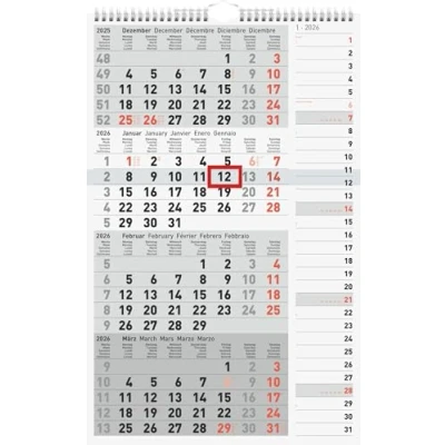 W/H: 300 × 490 mm, sheet size: 300 × 490 mm 1 sheet = 4 months, print colour: black/red, 70 g/m², wire-o binding with hanger, five languages: German, English, French, Spanish, Italian With right-aligned strip calendar of the current month With red date slider Rear in grey