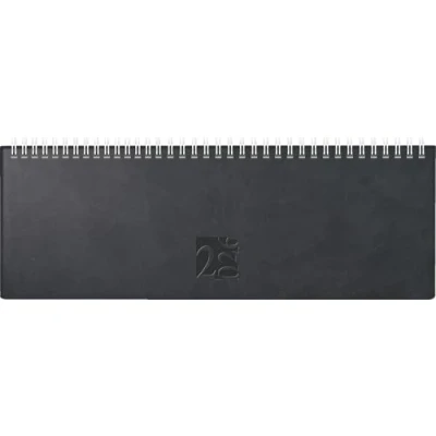 Sheet size: 307 x 105 mm 2 pages = 1 week, 112 pages, print colour calendar: grey/blue, 80 g/m², wire-o binding, six languages: English, German, French, Spanish, Dutch, Russian Faux leather cover West, hard cover, colour: black, year overview current year and following year, 2 pages worth knowing, 2 pages addresses For calendar year 2026