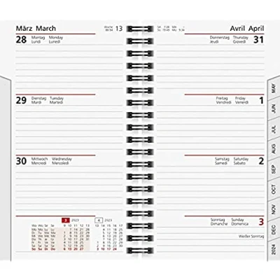 2 pages = 1 week Four languages: German, English, French, Italian Yearly overview of current year and following year Calendar with monthly tabs, reinforced tabs Cardboard envelope