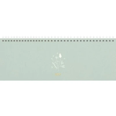 Sheet size: 297 × 105 mm 2 pages = 1 week, 128 pages, print colour calendar: brown, 90 g/m², wire-o binding Textile cover, colour: mint, gold and white embossing, 12 pages monthly plan current year, holiday dates Germany and Austria, 2 pages notes, 4 pages timetable For calendar year 2025