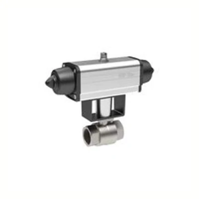 Stainless steel ball valve with pneumatic actuator Pneumatic double piston swivel drive, double swing mechanism Drive material: anodised aluminium. Ball valve material: stainless steel 1.4401/1.4301/1.4310/1.4408, flange plate ISO 5211