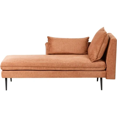 General description Embrace timeless design with the Right-Hand Chaise Lounge YERRES in vibrant orange. This minimalistic settee features a classic form with clean lines and a simple silhouette, blending seamlessly with any décor. Two thickly filled scatter cushions enhance comfort, while slim metal legs add a modern flair, making this chaise a versatile addition to your living space. Technical specifications Product Type: Chaise Lounge Style: Minimalist General Color: Orange, Black Main Material: Fabric Additional Material: Poplar Wood Filling Material: Fabric Material Composition: 100% Polyester Arm Style: Track Orientation: Right Hand Pattern: Solid Reclining: No Seat Construction: Sinuous Springs Seat Foam Density: 30 kg/m3 Dimensions: Width: 168 cm, Height: 79 cm, Depth: 87 cm, Seat Height: 42 cm, Seat Thickness: 11 cm, Armrests Height: 62 cm, Seating Surface: 154x70 cm Weight: 26 kg Weight Capacity: 300 kg Weight Capacity per Person: 300 kg Installation Full Assembly Required