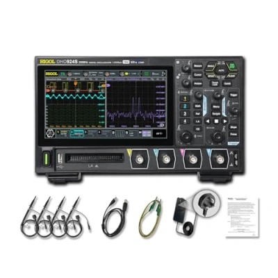 【Specifications】The DHO924S digital oscilloscope has a bandwidth of 250 MHz, a sampling rate of 1.25 GSa/s, and a memory depth of 50 Mpts. It is a four-channel oscilloscope with a time base range from 2 ns/div to 500 s/div and a vertical scale from 200 μV/div to 10 V/div. The waveform capture rate is 1,000,000 wfms/s. It features 16 digital channels and a 7-inch color touchscreen. The dimensions are 265.35 mm (length) × 161.75 mm (height) × 77.38 mm (width), and it weighs 1.78 kg. It is a portable digital oscilloscope 【12-Bit High Resolution】This oscilloscope features 12-bit high resolution and a low-noise design, enabling even the smallest signals to be captured accurately in demanding measurement environments. Ideal for high-quality electronics development and laboratory oscilloscope applications 【Multifunctional Measurement Instrument】This instrument includes a 25 MHz single-channel signal generator, 16 digital channels, a 3-digit digital multimeter, a frequency counter, and supports protocol decoding for RS232/UART, I2C, SPI, CAN and LIN. It also provides FFT analysis and automatic measurements, significantly improving test efficiency 【Ultra-clear Touchscreen & Compact Design】Equipped with a 7-inch HD touchscreen, Type-C power input and the ability to run from a power bank, this laboratory oscilloscope is ideal for fast and flexible field measurements 【Remote Control & Development Support】With USB, LAN and HDMI interfaces, plus an Android operating system, the oscilloscope enables PC remote control, supports secondary development, is SCPI-compatible, and integrates easily with LabVIEW, Visual Basic and Visual C++ 【Versatile Applications & Service Guarantee】The RIGOL DHO900 series portable oscilloscopes come with a 3-year warranty. They are perfect for field testing, troubleshooting, circuit development, embedded system design and laboratory applications, delivering high-precision, mobile measurement solutions