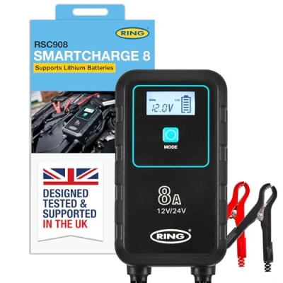 Ring Automotive RSC908 8A Smart Car Battery Charger, 12V & 24V Maintainer 9 Stage Charger for AGM, Leisure, Lithium, HGV, and Van Batteries, BLACK