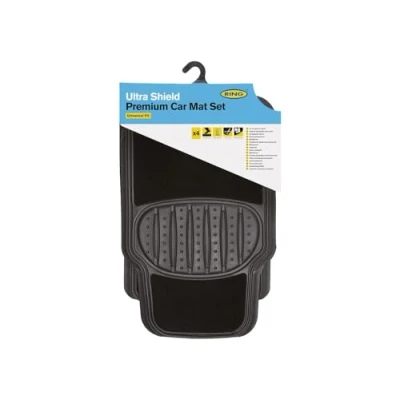 SET OF 4: Keep your car's interior protected with this black set of automotive Ultra Shield car mats DURABLE DESIGN: Made by Ring Automotive, these mats are designed for ultimate protection and style NON-SLIP BACKING: Ensures the mats stay securely in place while driving for safety on the road EASY TO CLEAN: Simply remove and wipe down to keep your vehicle looking fresh and clean at all times LONG-LASTING QUALITY: Invest in quality with these durable car mats that will stand the test of time Universal car mat, with trimmable features. Luxury thick carpet Patented non-slip backing Hard wearing Set of 4 mats (2 front, 2 rear)