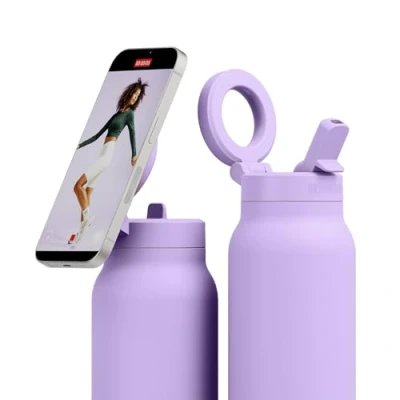 Insulated stainless steel water bottle. Its advanced double-walled vacuum insulation keeps drinks cold for up to 24 hours Inner silicone coated wrist provides added comfort and a splash of colour. Reinforced magnets for increased safety and maximum efficiency Wider, reinforced hinge provides improved strength and a higher rotation angle. The new hinge allows you to take photos or videos under the sight Sporty style mouthpiece with integrated straw The bottle holds the phone even when empty Available in 6 colours: black/ivory/blue/lilac/green/orange