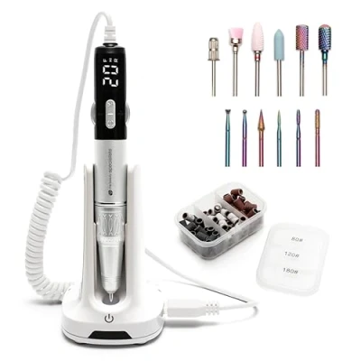 Salon‑Grade Performance - Achieve professional‑level results with this electric nail file & drill kit featuring a high‑speed motor up to 35,000 RPM and dual‑direction rotation – perfect for manicures, pedicures and acrylic/gel nail removal at home. All‑In‑One Kit - Comes complete with the electric nail file, a charging dock that doubles as a power bank, USB cable & a premium ceramic and tungsten carbide nail drill bit set. Suitable for filing natural & artificial nails and efficiently removes gel & acrylic coatings with low heat generation for comfortable use – everything you need for home nail care and extensions. Customisabe Speed Control - Clear LCD display shows current settings so you can precisely adjust speed and direction for natural nails, artificial extensions or thicker toenails – ideal for DIY or salon use. Lond Lasting Rechargeable Battery - With a USB rechargeable 4500 mAh battery offering up to 12 hours of runtime after a quick 4‑hour charge, you can enjoy cordless freedom and efficient filing sessions without interruption. Versitile Bit Set - Includes a ceramic barrel head, tungsten carbide barrel, diamond cone & ball heads, and a silicone polishing head – perfect for shaping, buffing, removing gel/acrylic and finishing smooth. Low Vibration and Ergonomic Design - The pen‑style handpiece is lightweight and engineered for comfortable use over longer sessions, reducing strain while delivering consistent motion for clean, smooth edges and enhanced nail finish. Ideal for Manicues and Pedicures - Designed to handle both delicate fingernails and thicker toenails, whether natural or extensions – this electric nail file tool is suitable for home beauty routines, mobile nail technicians and salon clients alike.