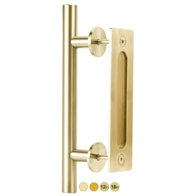 Introducing the Perfect Barn Door Handles for Elegance and Functionality! Receive 7-Set Kit : (1) Pull Handle Bar - 12" x 1", (1) Finger Pull Plate / Flush Pull - 8.5" x 2.3" (2) Matching Gold Screws - 2 3/8 inches (2) Round Pads to protect where the door meets the handle - 1 3/4 inch in diameter, (1) Wrench for screw installation. **door not included The matching screws are standard size for barn door handles. Use this kit for door panel thickness of 3/4 inch and 1-3/4 inch. ***For thicker door panels, longer screws can be purchased separately to ensure a proper fit*** Please measure! Slide with ease! Upgrade your interior with our exquisite collection of barn door handles. Whether you're aiming for a rustic, industrial, modern, or contemporary look, our pull handle and flush handle set will meet your needs perfectly. Our barn door pull handles are not just a stylish addition, but also a practical solution that ensures smooth operation every time you open or close your door. Crafted with utmost precision, these handles guarantee a seamless blend of form and function. Experience Unmatched Style with Our Barn Door Handles Stainless Steel! Elevate the aesthetics of your space with the allure of stainless steel. Our barn door handles in brushed gold finish offer a touch of luxury that complements various design themes. Whether it's a closet door pull handle or a larger barn door handle, their stunning appearance effortlessly turns them into statement pieces. This is a true investment for your home and an easy home improvement. Seamless Operation Meets Striking Design - Gold Barn Door Pull HandleLooking for heavy-duty yet stylish handles? Our gold barn door pull handle offers the best of both worlds. Its sleek design is a visual delight while the heavy-duty construction ensures reliable functionality. The large and pull barn door handle design makes it easy to open even the heaviest of doors with minimal effort. Elevate your barn door hardware game with this elegant and practical addition., Weight: 1.7196056436 Pounds, Manufacturer: Rio Salto
