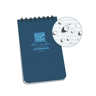 WEATHERPROOF PAPER: 100 pages / 50 sheets per pocket notepad. All-Weather paper won’t turn to mush when wet and will repel water, sweat, grease, mud, and even survive the accidental laundry mishap. Make sure your pocket notebook stays RIGHT in the Rain. WIRE-O BINDING: Tough impact-resistant Wire-O binding won't lose its shape in your back pocket or backpack. Unlike a standard spiral notebook, Wire-O keeps your open pages aligned and intact. WRITE IN THE RAIN: Use a standard pencil like a #2 Ticonderoga or an All-Weather Pen like a Fisher Space Pen and your notes will stay intact. Standard Ballpoint pens will work when paper is dry. Water-based inks will bead off Rite in the Rain paper sheets. WATERPROOF NOTEBOOK COVER: Polydura material creates a tough but flexible outer shell. Whether you're needing a hiking journal, outfitting your police gear, starting a golf journal, or just keeping a shower notebook, the Polydura Cover material will defend your field notes from scratches and stains. RECYCLABILITY: Unlike synthetic waterproof paper, wood-based Rite in the Rain is completely recyclable. Please recycle Rite in the Rain as you would other white or printed papers.