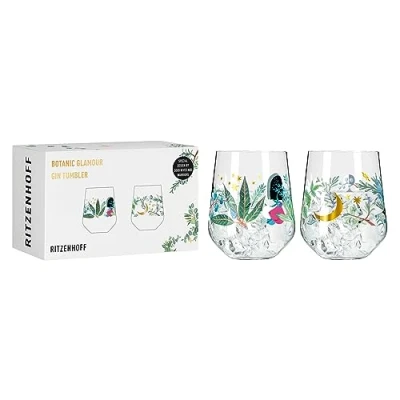 Design - The set gives exquisite times with elegant colour nuances a matching frame. The height is 21.8 cm, the diameter 10.7 cm, the weight is 220 g. Ideal for 0.7L gin blends with tonic Material: the crystal glass with a timelessly beautiful look and high brilliance is made in Germany and is dishwasher safe. Delivered in a gift box as a perfect gift Motif - The decor plays with botanical fabrics found in the gin. Combined with modern architectural forms, they convey a sense of urban life with exciting day-night contrasts Designer - Traditional drawings and digital creative tools combine the international artist duo Good Wives and Warriors to create detailed illustrations with impressive highlights Ritzenhoff - From the family-owned factory, we developed the company into one of the most renowned high-tech glassworks in Germany. We have been cultivating pure glassmaker art in the Sauerland since 1904