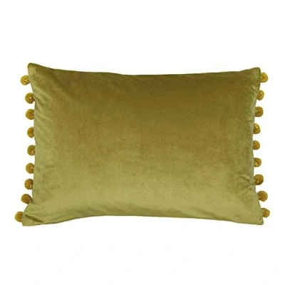 Riva Paoletti Fiesta Rectangular Cushion Cover Bamboo Green Gold Pompom Edges Faux Velvet Reversible Zip Closure 100% Polyester 35 x 50cm ( 14" 20" inches)