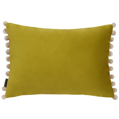Riva Paoletti Fiesta Rectangular Cushion Cover Bamboo Green Natural Beige Pompom Edges Faux Velvet Reversible Zip Closure 100% Polyester 35 x 50cm ( 14" 20" inches)