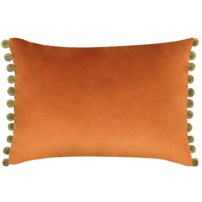 Riva Paoletti Fiesta Rectangular Cushion Cover Rust Orange Khaki Green Pompom Edges Faux Velvet Reversible Zip Closure 100% Polyester 35 x 50cm ( 14" 20" inches)