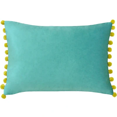Riva Paoletti Fiesta Rectangular Feather Filled Cushion Blue Green Pompom Edges Soft Velvet Fabric Discreet Zip Closure 100 Case (14" x 20" inches), Polyester, Teal/Bamboo, 35 50cm