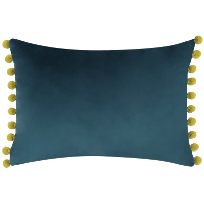 Riva Paoletti Fiesta Rectangular Feather Filled Cushion Blue Yellow Pompom Edges Faux Velvet Fabric Discreet Zip Closure 100 Case (14" x 20" inches), Polyester, Indigo/Olive, 35 50cm