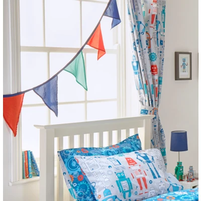 Whether your child is a tech genius or just likes to wipe their jammy fingers all over the TV they'll love the Robot curtains. These wonderful children's curtains have a pencil pleat header making them a good fit for any window area and come fully lined. The Robot curtains come with two fully matching, stainless steel ringed tiebacks. Specifically made to coordinate with the matching Riva Home Robot duvet set, toy and wall mural for a truly immersive experience.