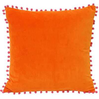 Riva Paoletti Polyester Filled Cushion Faux Velvet Fabric Contrasting Fuchsia Pink Pompom Edges Hidden Zip Closure 100% Soft (18" x 18" inches), Cotton, Orange, 45 45cm