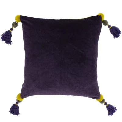Riva Paoletti Poonam Polyester Filled Cushion Damson Purple and Lemon Curry Yellow Faux Velvet Fabric Pompom Tassel Corners Machine Washable 100% Cotton 45 x 45cm (18" 18" inches)