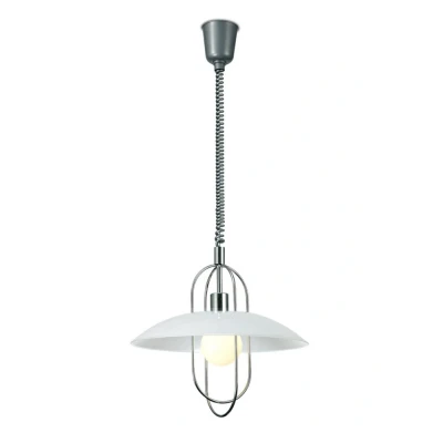 This combines unique contrasting components to produce a distinctive, modern collection of E27 single rise & fall pendants. The suspension is fashioned to mimic a traditional coiled phone wire, this then leads to the framework which mirrors a birdcage shape surrounding the lampholder. The centre of this framework is then encircled by an opal glass, fixed in a downward direction, shaped like a shallow dish. These pendants are available in five colour finishes; matt black, matt white, antique brass, polished brass and polished chrome ensuring this has a suitable pendant for any room decor.