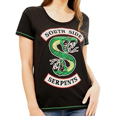 Women's Riverdale T-Shirt This Riverdale black top has the two headed snake which is the iconic logo for the Serpents. Join the gang at their favourite place Whyte Wyrm! Perfect for any Riverdale fans! Officially licensed Riverdale merchandise, exclusively designed for Character UK.