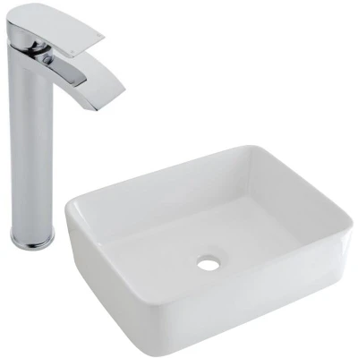 General description Elevate the style and elegance of your bathroom with the contemporary Milano Rivington rectangular countertop basin and high-rise mono basin mixer tap set. Featuring smooth lines and rounded corners, this premium quality ceramic basin with an easy-to-clean white glaze can be installed on a worktop or vanity unit to create a modern look. The durable solid brass tap boasts an intuitive lever handle to adjust the temperature and flow of water, complemented by an eye-catching chrome finish. Technical specifications Dimensions (basin): 480mm x 370mm x 130mm Dimensions (tap): 54mm x 103mm x 314mm Basin certified to EN14688 Compatibility and accessories Requires an unslotted or universal waste Requires a bottle trap Other information This product is covered for 10 years