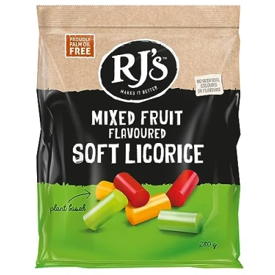 Mixed Fruit Flavoured Soft Licorice Suitable For Vegetarians No Artificial Colourings, Preservatives or Flavours Proudly GMO and Palm Oil Free Batch Made