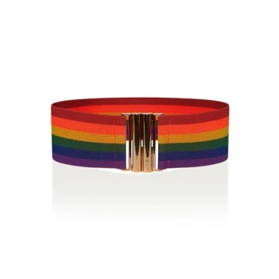 Modern Vintage Rainbow Pride Belt:A stylish wide elastic belt combining a modern vintage aesthetic with a bold rainbow pattern. Perfect for anyone looking to celebrate Pride or add vibrant color to everyday outfits. Available in S (6)–(10) / 24.5"–30"), M (12)–(16) / 28.5"–38"), and L (18)–(24) / 35.5"–47"). The elastic fabric ensures a secure yet comfortable fit for different body shapes and styles. Comfortable Stretch Fit for All-Day Wear:Made from a premium blend of 65% polyester and 35% elastane, this belt stretches comfortably around the waist while maintaining its shape. Ideal for daily wear with dresses, tops, or skirts. Wide 3-Inch Design for a Flattering Silhouette:The 3-inch-wide elastic band helps define the waist and creates a smooth, flattering fit. It’s perfect for styling vintage looks, retro outfits, or contemporary fashion. Versatile Pride Accessory for Any Occasion:Whether worn for Pride events, festivals, or casual fashion, this rainbow belt adds a fun and confident statement. Complements jeans, dresses, or workwear with ease.
