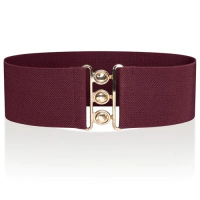 Ro Rox Retro Vintage Elastic Belt Women's Accessories 50s Nurse Stretchy With Silver Buckle & Clasp Waist Belts for Dress Wide Elasticated Design Women, Burgundy Gold, L