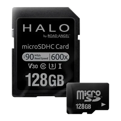 - This Road Angel microSDHC is designed for Halo dashcams, so you have enough space for all the footage you take while driving- With transfer speeds up to 90 MB/s, it can easily handle recording Ultra HD videos- 128 GB of storage gives you plenty of storage for all the videos from the front an rear cam for up to 16 hours- It comes with an SD adapter, so you can use it with an SD card slot