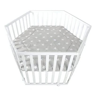 The hexagonal playpen in white wood is equipped with a cosy textile insert in an adorable Little Stars design and flat bars. Safety tested playpen provides ample play and cuddle area. The 3-level adjustable height invites parents to play with their babies. The wheels with brakes ensure a secure hold and mobility of the playpen. The grille has been developed according to the latest safety standards according to DIN EN 12227:2010-12 All materials used are certified and tested regularly. The varnish is food-safe and skin-friendly. Age of the child: from 0 to 24 months The hexagonal playpen from roba can hold up to 15 kg and is a beautiful, safe playground from birth and guarantees a long time use and where children love to discover the world.