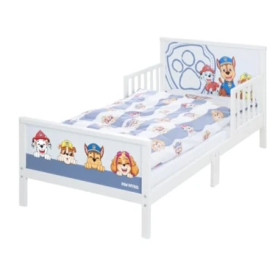 COMPLETE ACCESSORIES: The children's bed comes with a slatted base, a duvet cover 100 x 135 cm and a pillowcase 40 x 60 cm; 2 side rails provide extra protection to prevent falls CERTIFIED MONTESSORI DESIGN: This bed is designed in accordance with Montessori principles to promote independence and autonomous learning for toddlers; It also complies with the current safety standard EN 716-1/-2:2008 + A1:2013 PAW PATROL THEME - The striking prints on the headboard and footboard feature beloved characters from the series, including dogs Chase, Marcus, Ruben and Stella as well as the design of a large paw on the headboard COMPLETE COLLECTION: Pair our toddler bed with other pieces of furniture from Roba's Paw Patrol collection, such as the toy shelf, wall chart, toy chest, and much more to create a harmonious bedroom SPECIFICATIONS: Dimensions H 63 x W 145 x D 75 cm; Mattress Size: 70 x 140 cm; Material: Plywood/MDF; Age range: 2 - 7 years (load capacity up to 35 kg); Bed height: 18 cm + mattress thickness