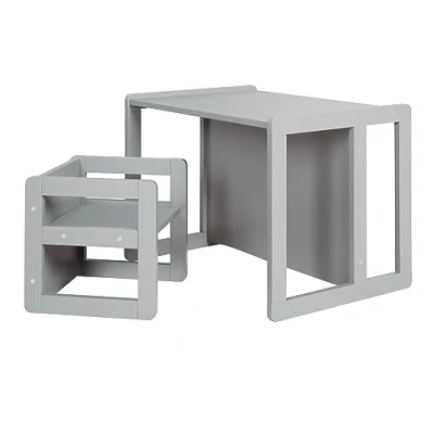 3-IN-1 VERSATILE SET: including a reversible table and chair, perfect for a variety of activities such as: having meals, doing schoolwork, drawing, and many more HEIGHT ADJUSTABLE: 2 seat heights for the bench (18 cm and 27.5 cm) and 3 heights for the chair (14 cm, 18 cm, and 29 cm), easily accessible to accommodate your child's growth SAFETY AND COMPLIANCE: Designed without pinch points and compliant with the EN 71-1:2014 standard; Weight capacity of 60 kg for the table and stool, 40 kg in bench mode, and 30 kg in chair mode EASY ASSEMBLY AND CLEANING: The convertible table and chair are quick to assemble using the provided instructions; Smooth surfaces make cleaning easy, a simple wipe is sufficient to keep them clean SPECIFICATIONS: Dimensions: Table L 61 x W 44 x H 44 cm, Chair L 30 x W 30 x H 30 cm - Material: playwood - Color: grey / taupe - Suitable for children aged 9 months to 10 years