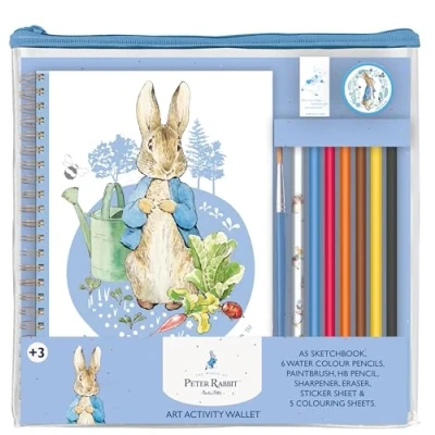 ENCOURAGE CREATIVITY: Encourage your budding young artist with this art activity wallet featuring beloved character Peter Rabbit. Children will love choosing from the selection of coloured pencils and fun stickers. WHAT’S INCLUDED IN THE WALLET: This art activity set comes with a gorgeous A5 sketchbook, 6 watercolour pencils, paintbrush, HB pencil, sharpener, eraser, sticker sheet and 5 colouring sheets. The sketchbook, eraser and sharpener are all decorated with iconic Beatrix Potter artwork. PAINT, DRAW AND COLOUR: Let your child’s imagination run free and see what they can create with this art kit. All the pieces are safety tested and suitable for children. COMPACT AND PORTABLE: The art activity set comes in a handy compact plastic wallet with a sturdy zip closure, so it’s easy to keep all the pieces safe and together. CREATIVE AND MINDFUL: Encourage creative screen-free time for children by promoting imaginative skills with drawing and colouring.