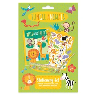COMPLETE SET: Includes A5 exercise book, decorative ruler, pencil, eraser and sharpener, plus a vibrant sticker sheet featuring adorable jungle animals CHILD-FRIENDLY DESIGN: All items feature charming jungle animal artwork and are specially designed for children aged 3 years and above STICKER COLLECTION: Colourful sticker sheet includes various jungle creatures like lions, giraffes, monkeys, zebras, and more for creative play STORAGE SOLUTION: Comes in a practical cardboard envelope decorated with jungle themes to keep all stationery items organised DIMENSIONS: A5-sized exercise book with 15 cm ruler, perfectly sized for young children's hands and school bags