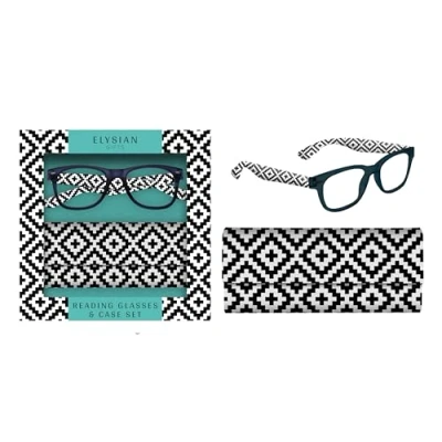 BEAUTIFUL DESIGN: Our stylish glasses case and reading glasses feature a stunning black and white geometric design. The case is designed with a soft interior and comes with a cleaning cloth making it the perfect gift. COMFORTABLE GLASSES: These stylish reading glasses are designed with rubberised frames to provide a comfortable grip and keep them in place, while high-quality sprung hinge arms are used to allow flexibility without breaking. MAKES A GREAT GIFT: This geometric reading glasses and case set makes a beautiful gift. The glasses are available in the standard prescription strengths of +2, +2.5 and +3 so you can choose the correct lens. STYLISH PROTECTION: The glasses case is designed to provide maximum protection for your glasses, and our cases are crafted from durable materials to withstand everyday wear and tear.