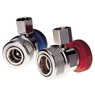 Designed to connect Robinair Enviro-Guard hoses to service ports on automotive R-134a A/C systems Quick-connect design includes an integral safety sleeve which protects against injury and refrigerant loss if the coupler is disconnected under pressure Compact design easily fits into tight quarters The 6-ball coupler design provides a more stable grip on the fitting than lesser 4-ball designs Set includes 1ea. low-side and high-side manual couplers