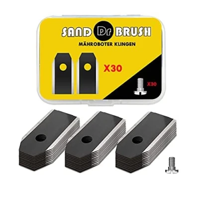 PERFECT REPLACEABILITY : SAND DR BRUSH replacement Lawn Mower Blades Each blade weighs 3g and is 0.75mm thickness. Rust-free stainless steel and titanium coating which makes them more resistant to wear and tear.These matching screws are the ideal replacement DURABILITY& GOOD CUTTING PERFORMANCE : Rust-free stainless steel and titanium coating which makes them more resistant to wear and tear.Unique cutting blades can be used for longer,improving the mower's performance and even more precise than before.Keep the lawn clean, green, and healthy SAFETY& EASY TO REPLACE : The robotic lawnmower blades are titanium blades ease to resistance stones and guarantee the best possible safety for children and animals.Even in bad weather, they cut efficiently and reliably.The blade is double-sided and the screws are easy to install and remove. COMPATIBILITY : The SAND DR BRUSH replacement Lawn Mower Blades are Suitable Fits Husqvarna Automower,Gardena Robot Mower ect. What Will you get : Our SAND DR BRUSH replacement blade set contains 30 carbon steel lawnmower blades with special titanium coating and 30 anodized screws (cross + slot). NOTE:If you feel that our product is not up to your Auto mower, please return for a full refund., Manufacturer: RUIZHIBAO
