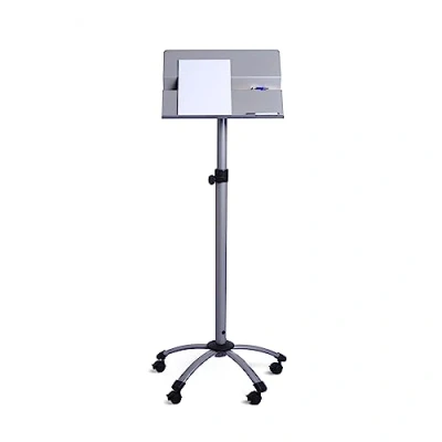Metal lectern for mobile presentations Metal structure One shelf holds notes and handouts Easy assembly Adjusts from 41-57 inches in height