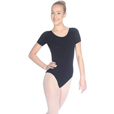 Cotton/Lycra short sleeved leotard from Roch Valley Dancewear Cut just above the bra lining Available in Black only An excellent leotard and good basic to build a dance outfit on Perfect for dance class or performances