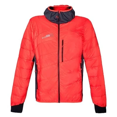 100% PA 38 GSM microripstop nylon Double Lycra cuffs Lateral inserts, submanic and hood made of elasticized batteries for a comfortable fit Packable hybrid jacket with a special bag designed to occupy a minimum space and to be hung on the harness Head designed and developed in collaboration with the spiders of Lecco, professional mountaineers