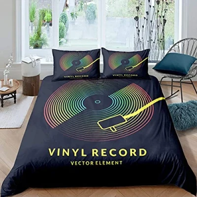 Rock Music Duvet Cover Vinyl Record Comforter Hip Hop Hippie Grunge Style Quilt Rainbow Iridescent Bedding Set (No Comforter) Black Dorm Decorative 3Pcs King Size