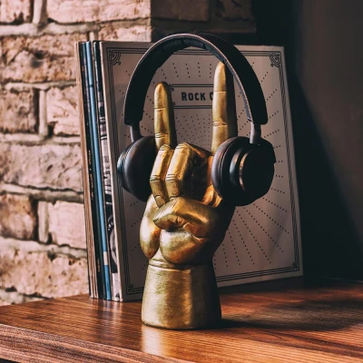 Rock On Headphone Stand: What is it? It’s a rock-themed headphones stand! St-hand? Nope, just stand. It’s great for holding over-ear headphones and wired earbuds. What does it do? Modelled in the (rock of) age old gesture for good music, this Rock On headphone display stand, well, stands there and displays your headphones… and your taste in music! You can fit on-ear headphones over the stand and wrap wires around the fingers, using its (sweet) grooves to hold them in place. Why you should buy it Buy this because you want a place to keep your headphones so they don’t get (Glaston)buried under mounds of stuff. With this ‘Rock On’ headphones stand, you won’t (Lollapa)looze them ever again. Order yours now!