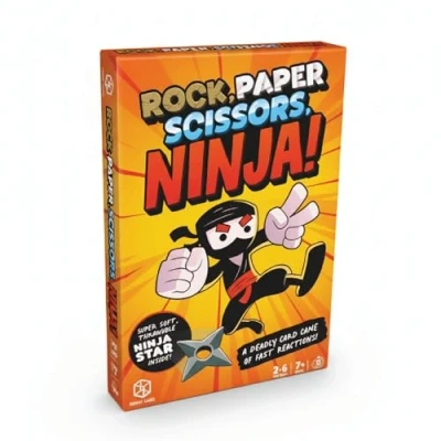 GAMEPLAY CONCEPT: Fast-paced card game combining traditional Rock, Paper, Scissors with ninja-themed action and quick reflexes for 2-6 players aged 7 and up UNIQUE FEATURE: Includes super soft, throwable ninja star accessory that adds an exciting physical element to the traditional card game format GAME MECHANICS: Players must react quickly to special cards - bowing to Sensei cards and grabbing the ninja star when ninja cards appear WINNING STRATEGY: Success depends on being the fastest to react and strategically losing cards, with the game ending after six Sensei cards are played BATTLE ROYALE FORMAT: Features exciting multi-player showdowns where players compete simultaneously in Rock, Paper, Scissors challenges, Manufacturer: Format Games