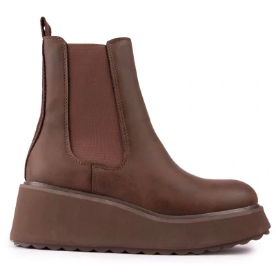 Womens brown Rocket Dog heyday boots, manufactured with synthetic and a synthetic sole. Featuring: heel height 6cm, textile lining, heel pull tab, elastic gusset and block heel.
