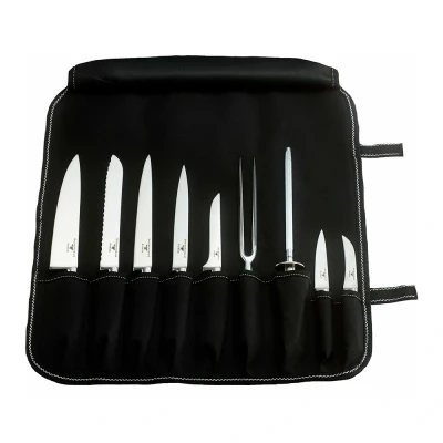 The Rockingham Forge 10 Piece Classic Chef's Knife Set with Riveted Handles is the perfect addition to any kitchen. These knives are made from quality materials to ensure they will last for years and provide a lifetime of use. Includes a deluxe soft role case to protect against damage.