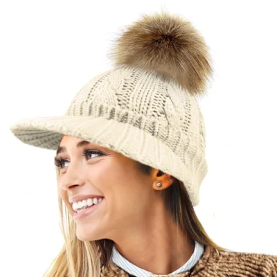 RockJock Ladies Warm Fleece Lined Knitted Peaked Beanie Baseball Cap with Detachable Faux Fur Pompom wear or Without 1 Natural