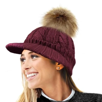 A new twist on a peaked beanie hat/cap This versatile knitted cap comes with a detachable faux fur pompom and can be worn with or without giving 2 different looks. Fully lined with a warm soft fleece Available in 11 colourways